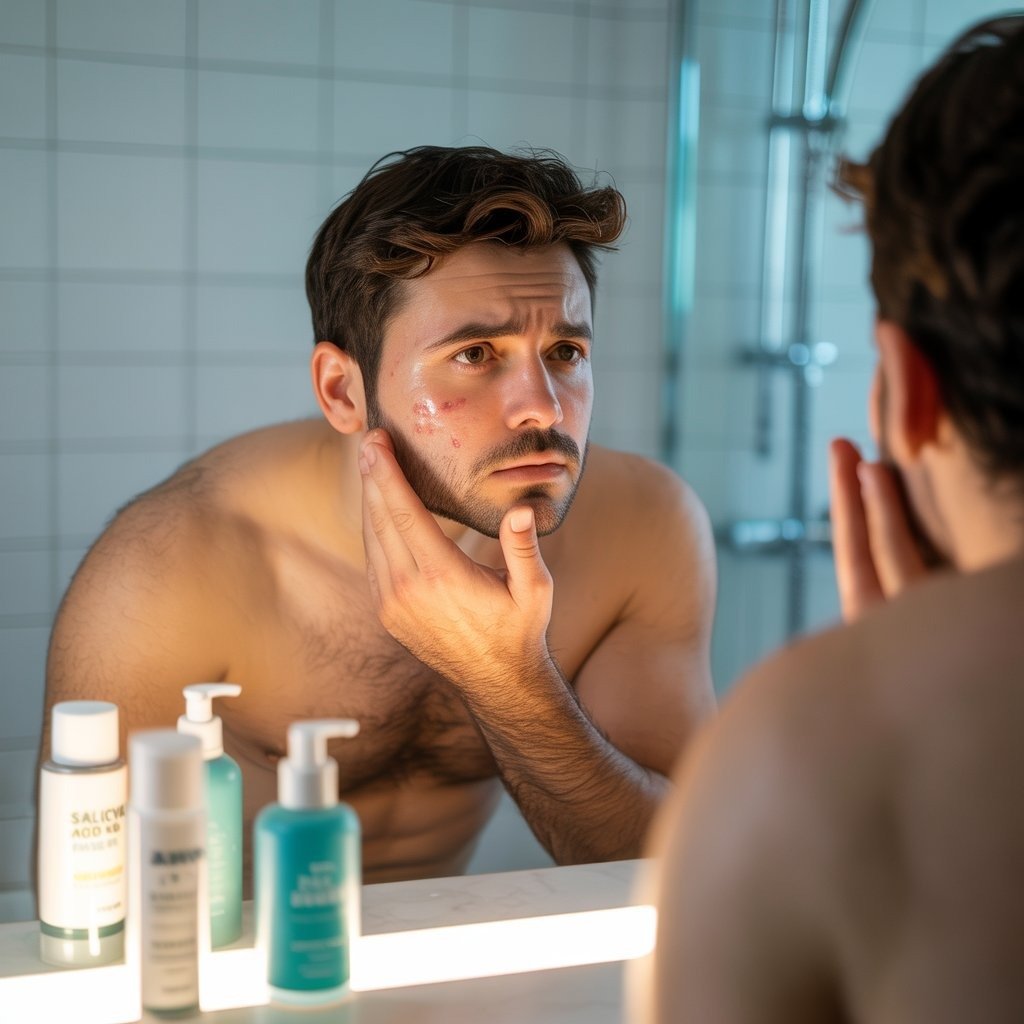 Acne is a common condition among men due to the high oil production in their skin and the irritation caused by shaving. Solutions: